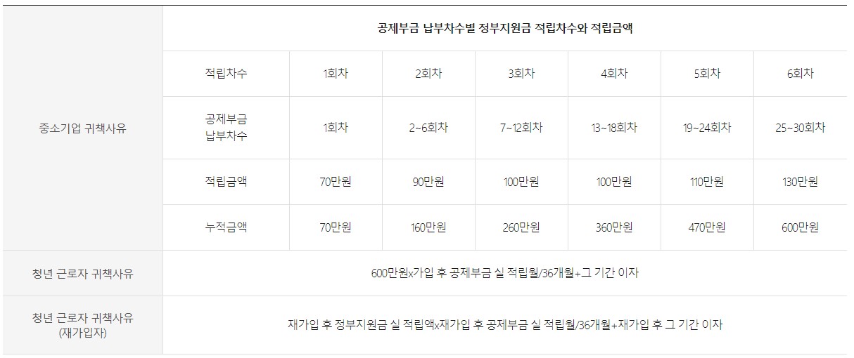 - 정부 : 3년간 600만원 적립(3년간 6회 분할적립)(적립방식) 3년간 총 6회(1, 6, 12, 18, 24, 30개월)에 걸쳐 성과