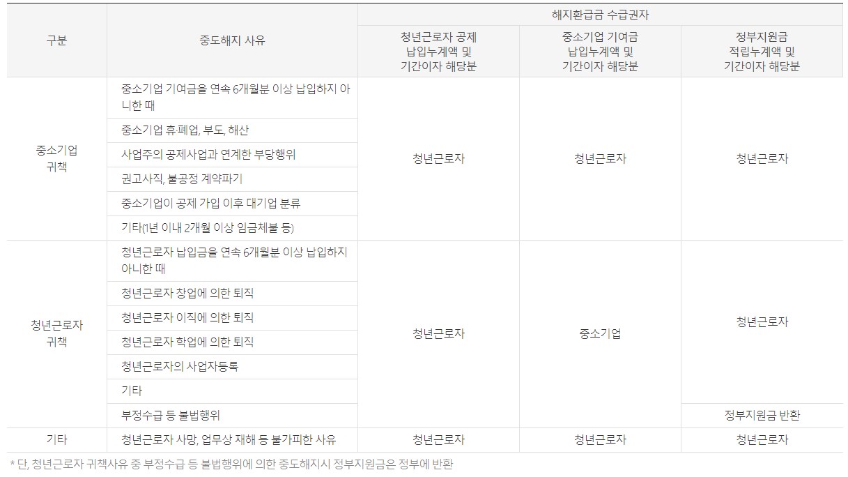 청년 귀책 | 중소기업 기여금은 기업이 수령하고, 청년근로자 납입금 및 정부지원금은 청년근로자가 수령. |